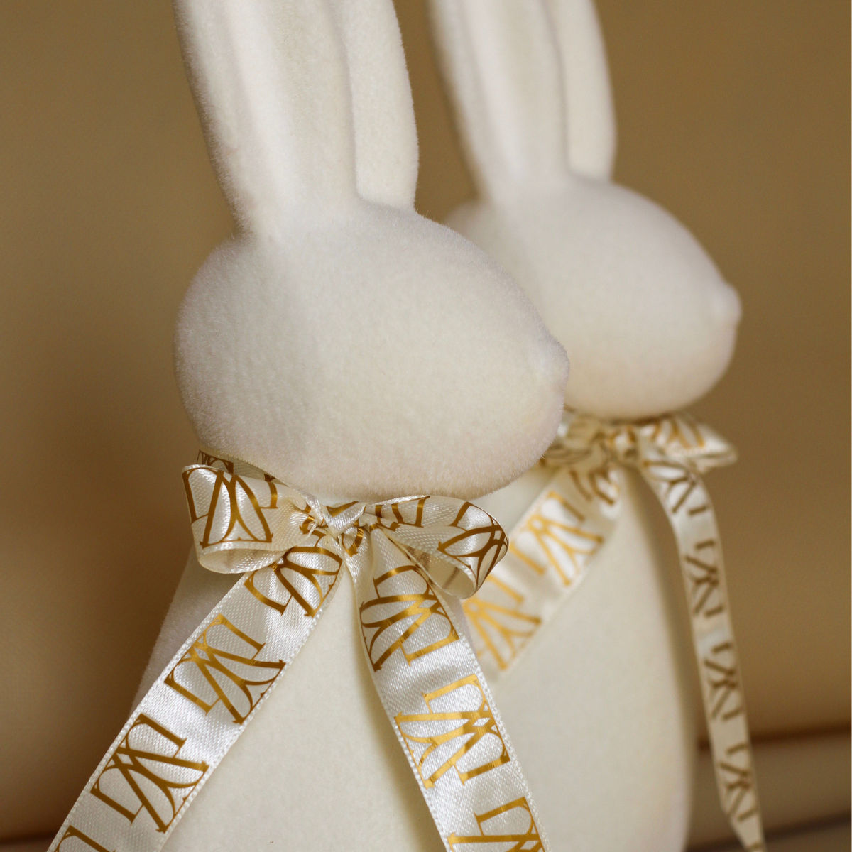Zając ozdobiony jest dopasowaną kolorystycznie kremową kokardą ze złotym logo Zora Gifts, co podkreśla unikatowy charakter produktu. Stanowi stylowy dodatek do Twojego domu lub gotowy upominek na nadchodzące święta.